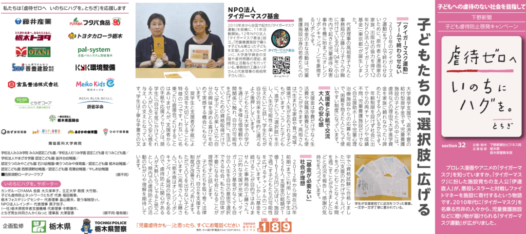 オレンジリボン運動 発祥の地・栃木県の「下野新聞 」さんに、タイガー進学支援制度について、ご紹介いただきました。下野新聞さんは、子どもたちが無条件に人と地域に愛される地域を目指し、新聞紙面を通じた様々な呼びかけに取り組んでおられます。今回もタイガーマスク基金の活動について、丁寧にご紹介いただき、感謝の気持ちでいっぱいです。