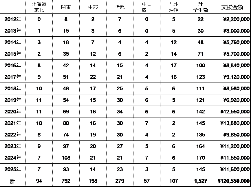 2025年度は、児童養護施設や自立援助ホームなどの社会的養護の施設から大学進学した新入生20名と進級できた学生125名に、一人当たり5万円の返済不要の支援金を届けました。さらに、実習や就職活動で多忙となる3年生と4年生には一人当たり5万円の後期支援金も届けることができました。今年度、学生に届けた支援金総額は1,160万円、2012年からの支援額合計は1億2千55万円にもなります。ご協力いただきました全ての皆さまに御礼申し上げます。