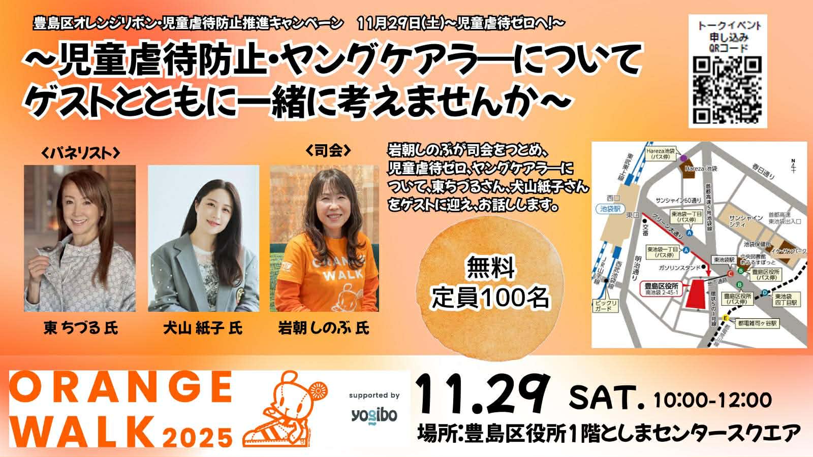 ゲストとして、俳優であり社会活動として活躍されている「東ちづるさん」や様々なこどもたちを支援されているエッセイストの「犬山紙子さん」をお迎えします。司会はORANGEWALK主催団体である 認定npo法人 日本こども支援協会の岩朝代表が担当されます。