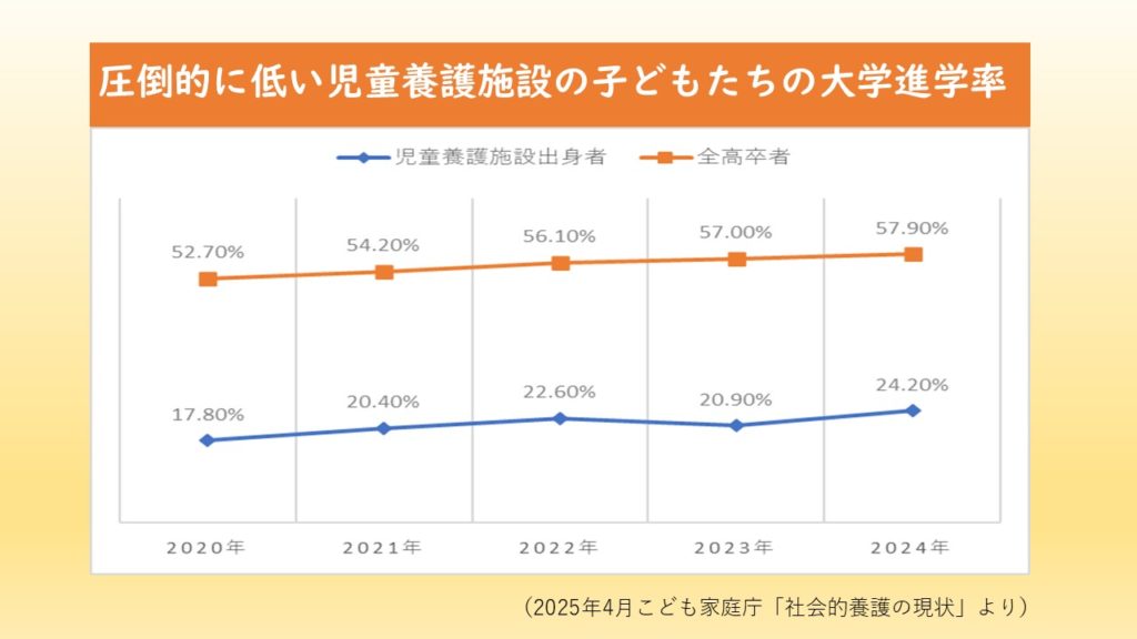 日本における大学進学率は5‐6割程度ですが、児童養護施設からは2割程度。タイガーが活動を始めた頃は、1割程度でしたから少しずつ増えているものの、まだまだ格差があります。もちろん大学進学がすべてではありませんが、大学進学したいと思ってもお金が足りない、そもそも選択肢として考えることができなかったという子どもたちも少なくありません。